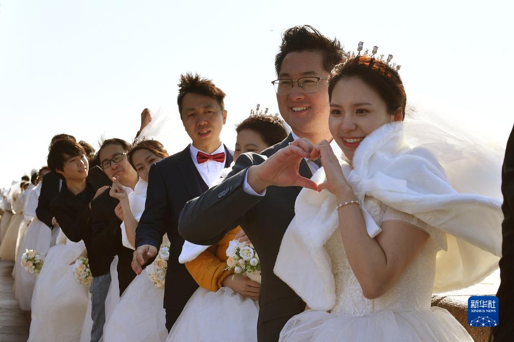 當日,2023年青島市市南區新時(shí)代文明實(shí)踐集體婚禮在百年棧橋舉行,百對新人手持鮮花以大海為證,喜結連理。