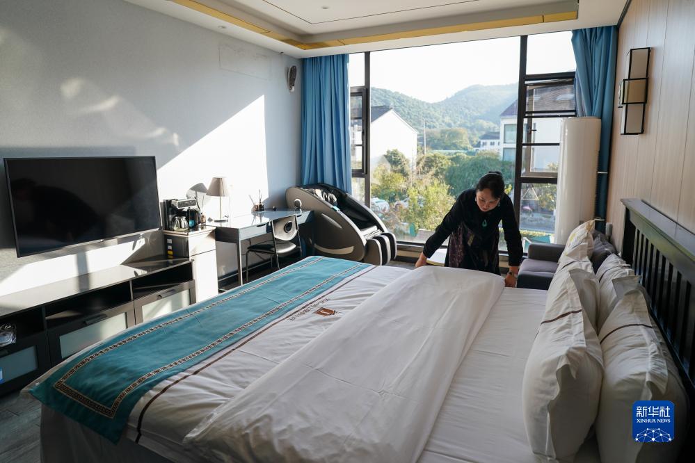在樹(shù)山村一處民宿,工作人員在整理打掃民宿房間(11月2日攝)。