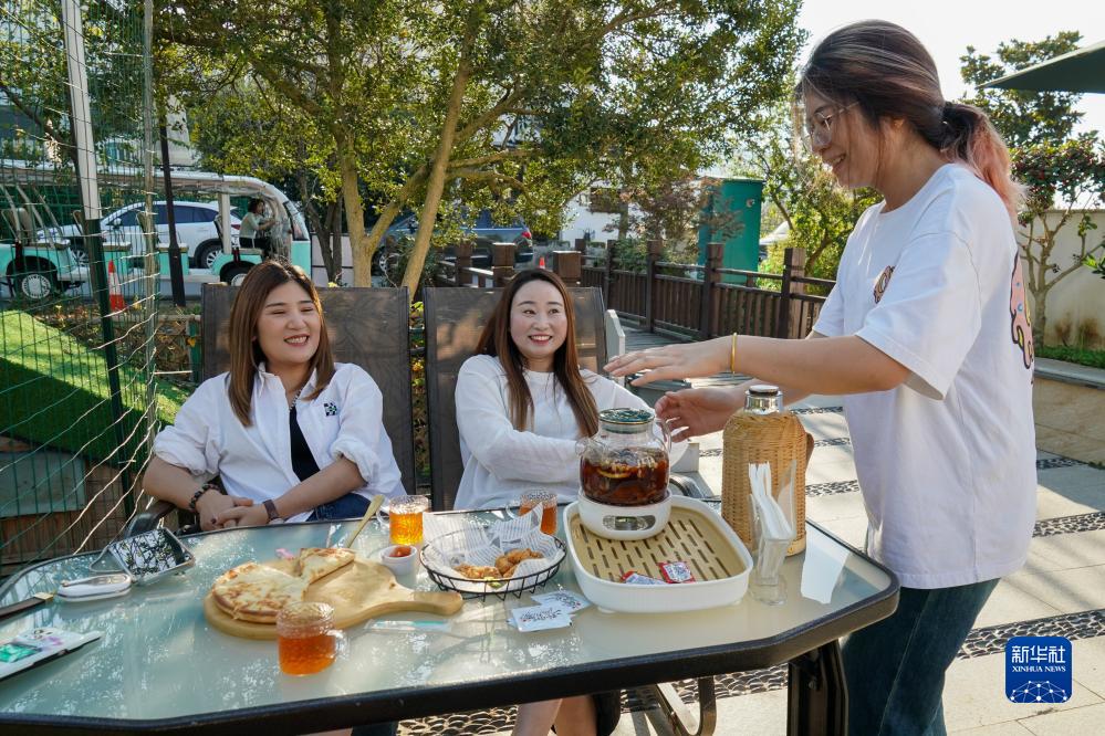 在樹(shù)山村的一家民宿內,工作人員(右)在為游客倒茶(11月2日攝)。