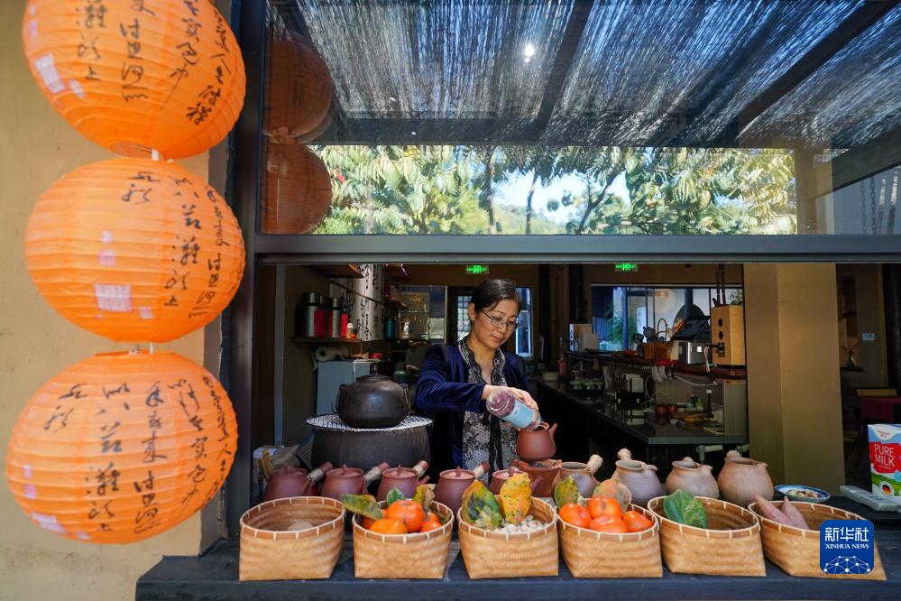 工作人員在樹(shù)山村的一家民宿內為游客制作茶飲(11月2日攝)。