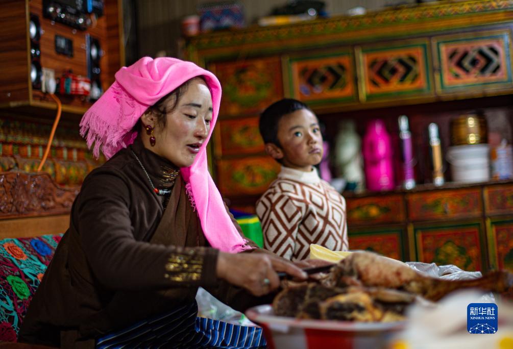 西藏當雄縣納木湖鄉達布村的冬季放牧點(diǎn)上,牧民芝嘎措姆在給兒子多吉扎西切牛肉(11月10日攝)。