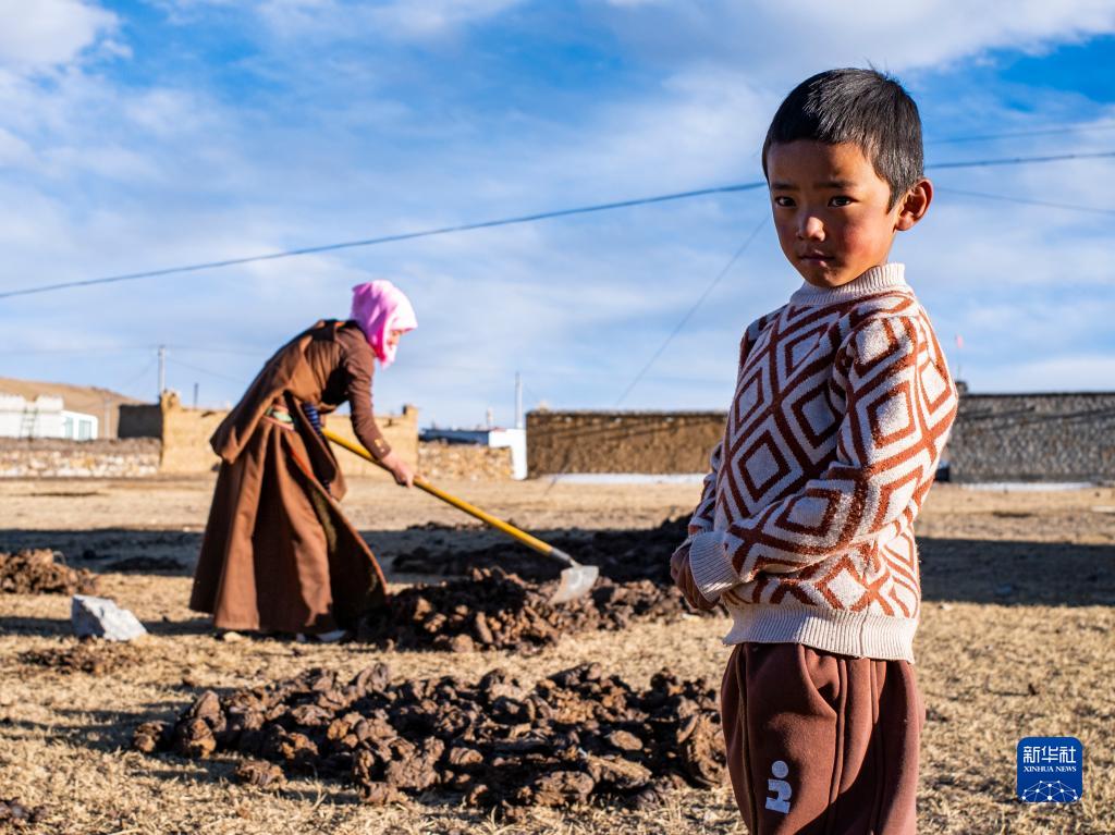 在西藏當雄縣納木湖鄉達布村的冬季放牧點(diǎn),多吉扎西(右)在幫助媽媽芝嘎措姆制作取暖用的牛糞餅(11月10日攝)。