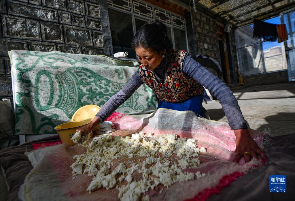 在西藏當雄縣納木湖鄉達布村的冬季放牧點(diǎn),牧民在制作奶渣(11月10日攝)。