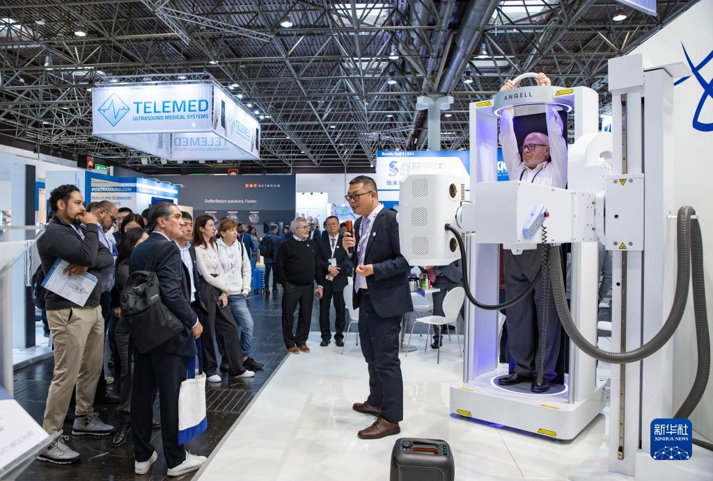 11月13日,在德國杜塞爾多夫國際醫療器械設備展,參觀(guān)者觀(guān)看安健科技負重位CT產(chǎn)品海外發(fā)布。新華社記者 張帆 攝