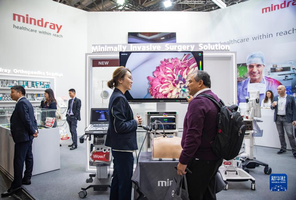 11月13日,在德國杜塞爾多夫國際醫療器械設備展,參觀(guān)者在邁瑞醫療展位咨詢(xún)洽談。新華社記者 張帆 攝