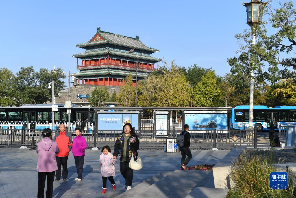 游客在正陽(yáng)門(mén)城樓前參觀(guān)游覽(11月6日攝)。正陽(yáng)門(mén)是中國明、清兩代王朝都城的正南門(mén),坐落在老北京城的南北中軸線(xiàn)上,俗稱(chēng)前門(mén)。1988年,正陽(yáng)門(mén)城樓和箭樓被國務(wù)院批準列入第三批全國重點(diǎn)文物保護單位。