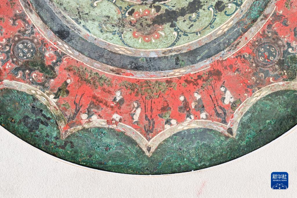 西漢彩繪人物車(chē)馬鏡局部彩繪圖案“謁見(jiàn)”(8月25日攝)。新華社記者 李賀 攝