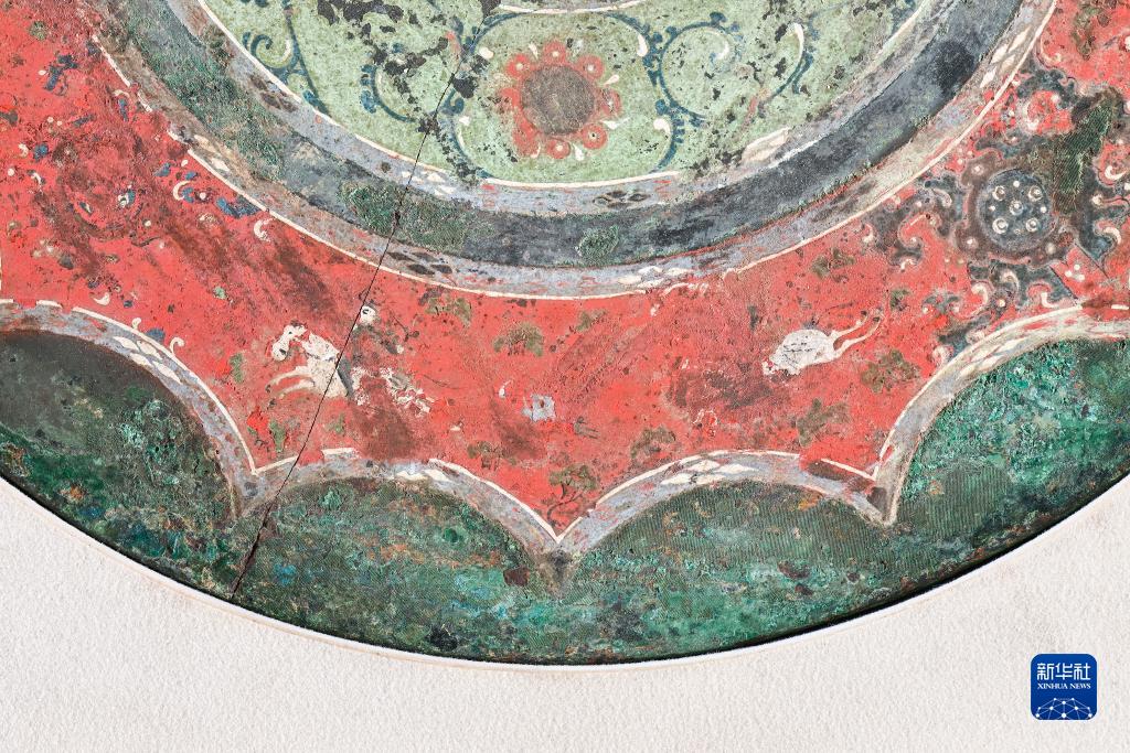 西漢彩繪人物車(chē)馬鏡局部彩繪圖案“狩獵”(8月25日攝)。新華社記者 李賀 攝