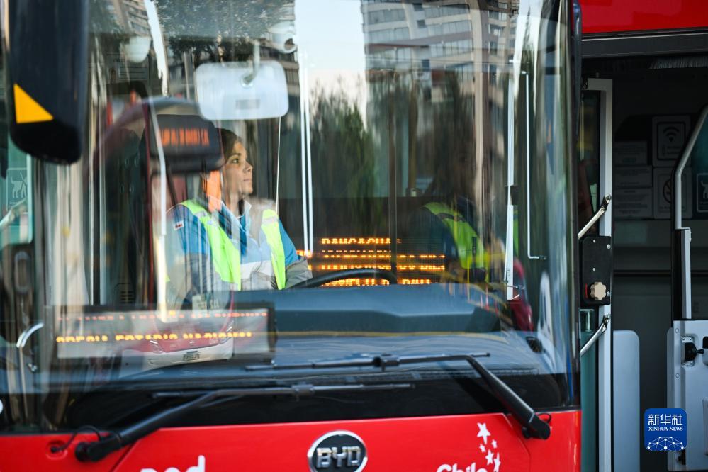 11月2日,在智利首都圣地亞哥,520路新能源公交車(chē)司機寶拉準備發(fā)車(chē)。