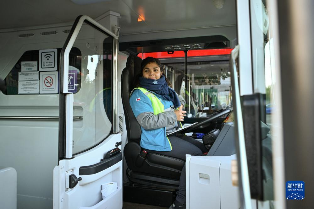 11月2日,在智利首都圣地亞哥,520路新能源公交車(chē)司機寶拉準備發(fā)車(chē)。