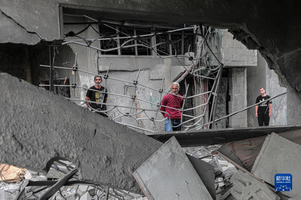 這是11月13日在加沙地帶中部地區拍攝的一個(gè)遭以色列空襲的建筑廢墟。