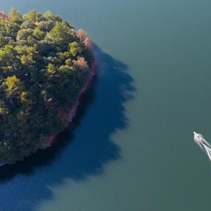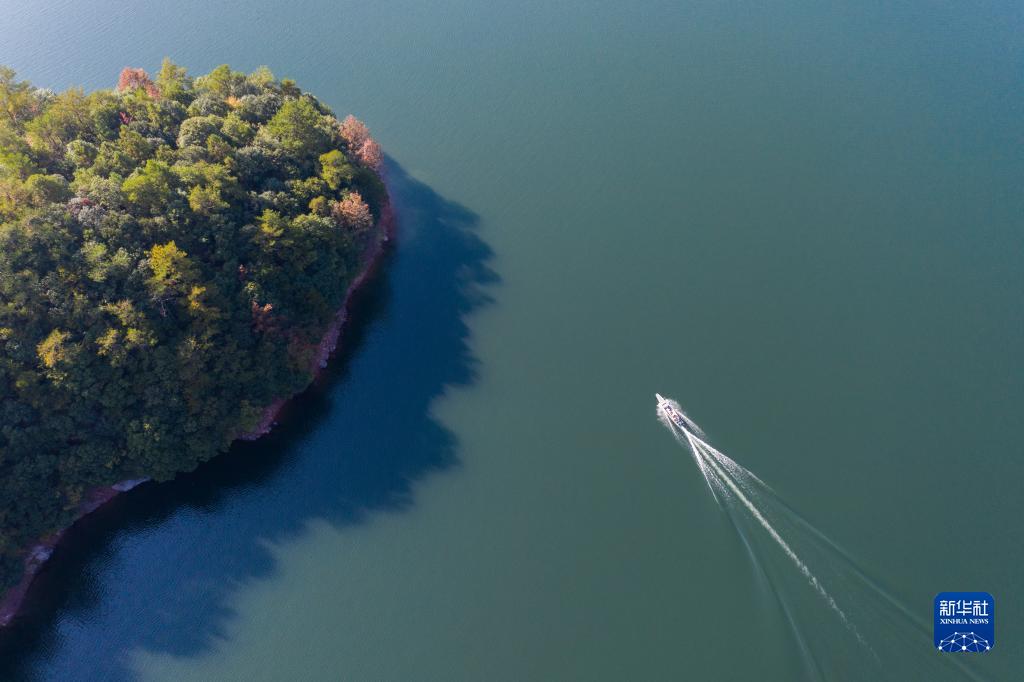 11月14日,淳安縣金峰鄉錦湖村的低收入農戶(hù)在金峰鄉中華蜂保種基地工作人員的陪同下乘坐小船前往養殖中華蜂的小島收蜂蜜(無(wú)人機照片)。