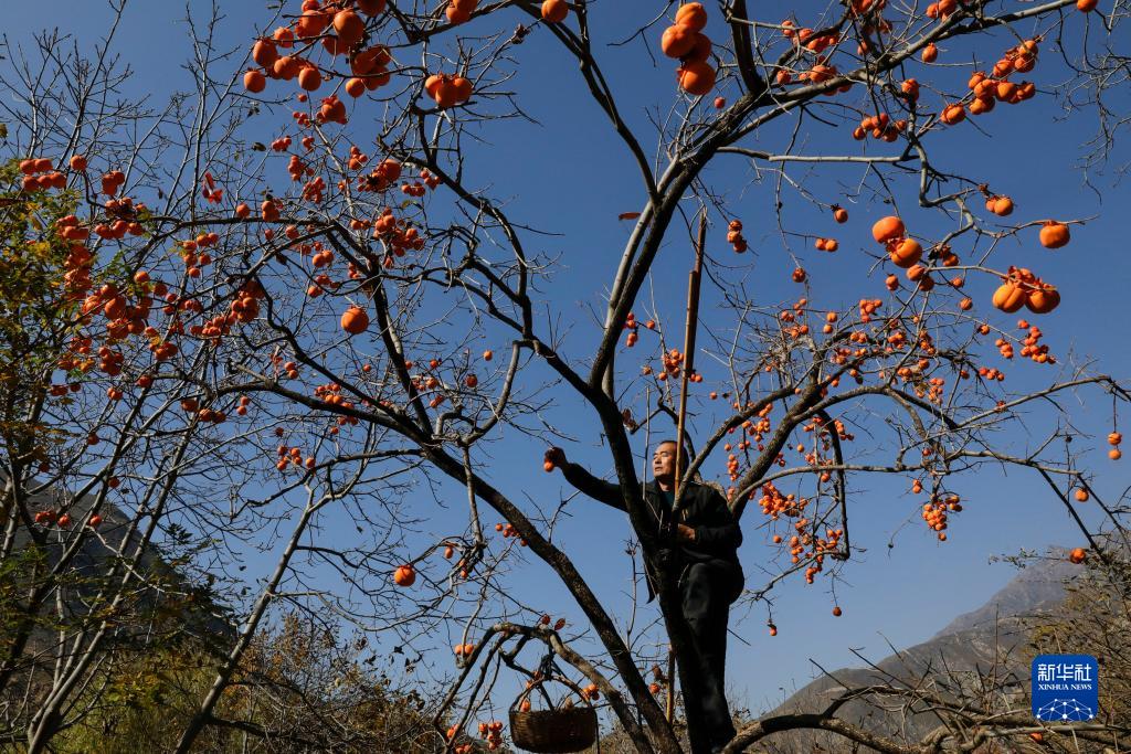 11月14日,在甘肅省甘南藏族自治州舟曲縣立節鎮杰迪村,村民在采摘柿子。