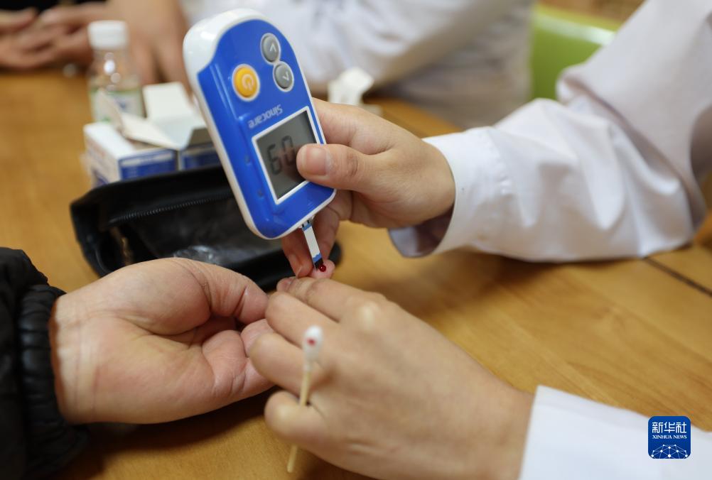 11月14日,在山東省臨沂市沂南縣界湖街道后中疃社區,醫護人員為居民免費測量血糖。