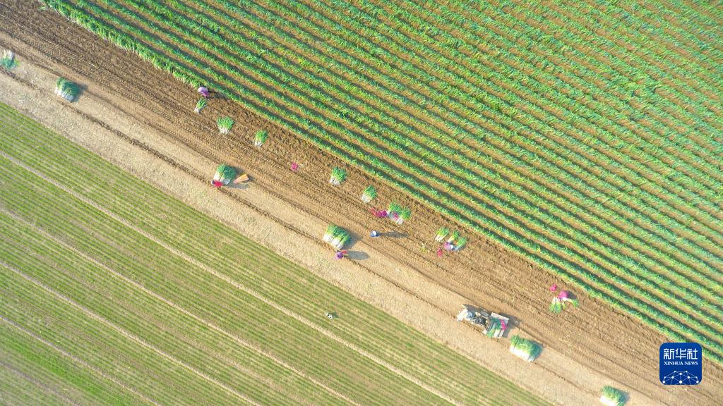 11月14日,山東省聊城市茌平區賈寨鎮邢胡劉村農民在田間收獲大蔥(無(wú)人機照片)。