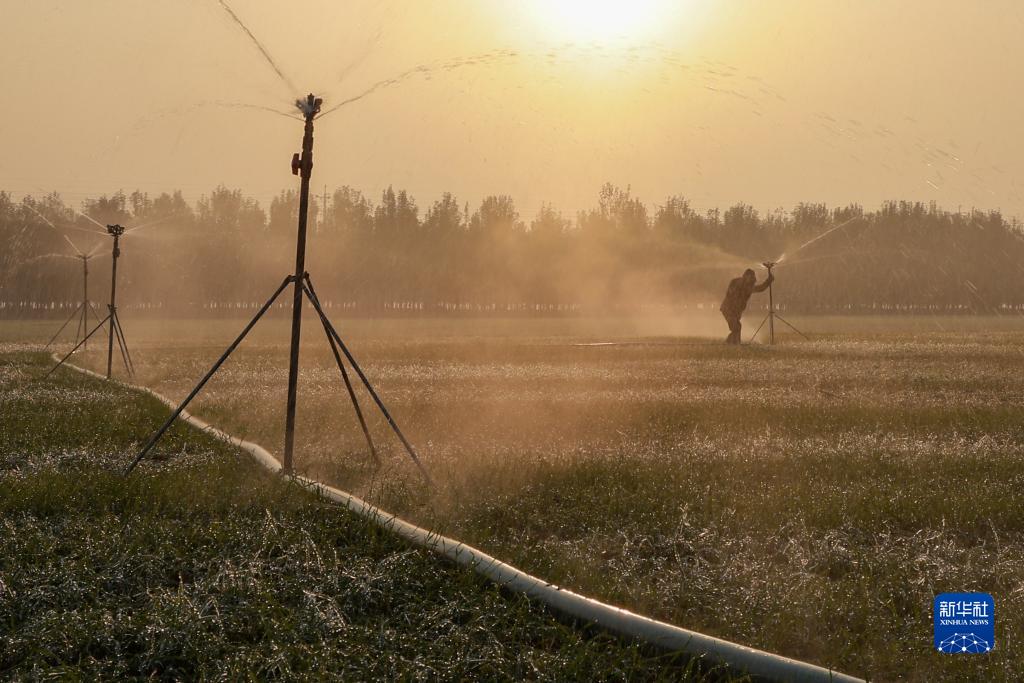 11月14日,河北省邢臺市內丘縣大壘東村農民使用噴灌設備給冬小麥澆封凍水。