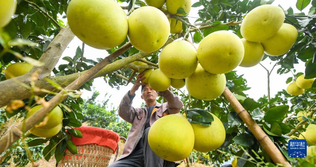 11月14日,村民在貴州省遵義市桐梓縣小水鄉田上村山上采摘蜜柚。