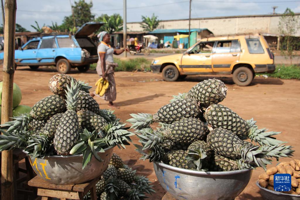 這是在貝寧“甜面包”菠蘿主產(chǎn)區澤鎮一家水果攤拍攝的菠蘿(2023年10月23日攝)?!疤鹈姘辈ぬ}是貝寧首個(gè)獲得非洲知識產(chǎn)權組織認證的地理標志產(chǎn)品。近日,在第六屆中國國際進(jìn)口博覽會(huì )上,空運來(lái)華的1000公斤貝寧“甜面包”菠蘿首次與中國公眾見(jiàn)面。
