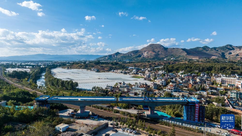 11月14日,阿里塘特大橋兩片連續梁成功轉體,在滬昆鐵路上方實(shí)現精準對接(無(wú)人機照片)。