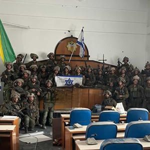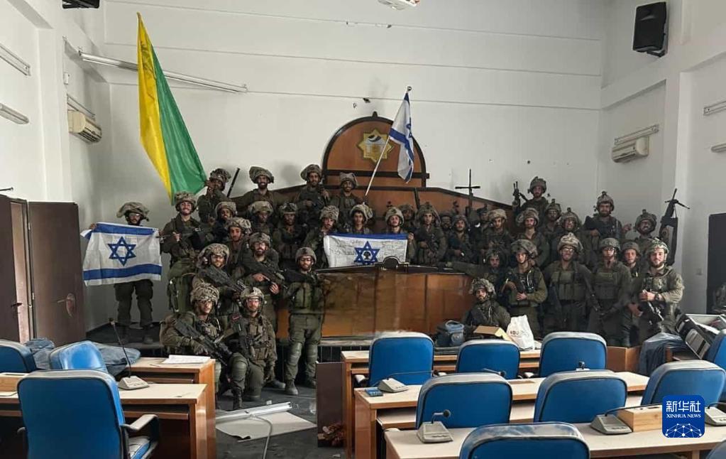 這張以色列媒體11月13日刊發(fā)的照片顯示,以色列國防軍士兵在加沙城巴勒斯坦伊斯蘭抵抗運動(dòng)(哈馬斯)立法委員會(huì )大樓里舉著(zhù)以色列國旗。