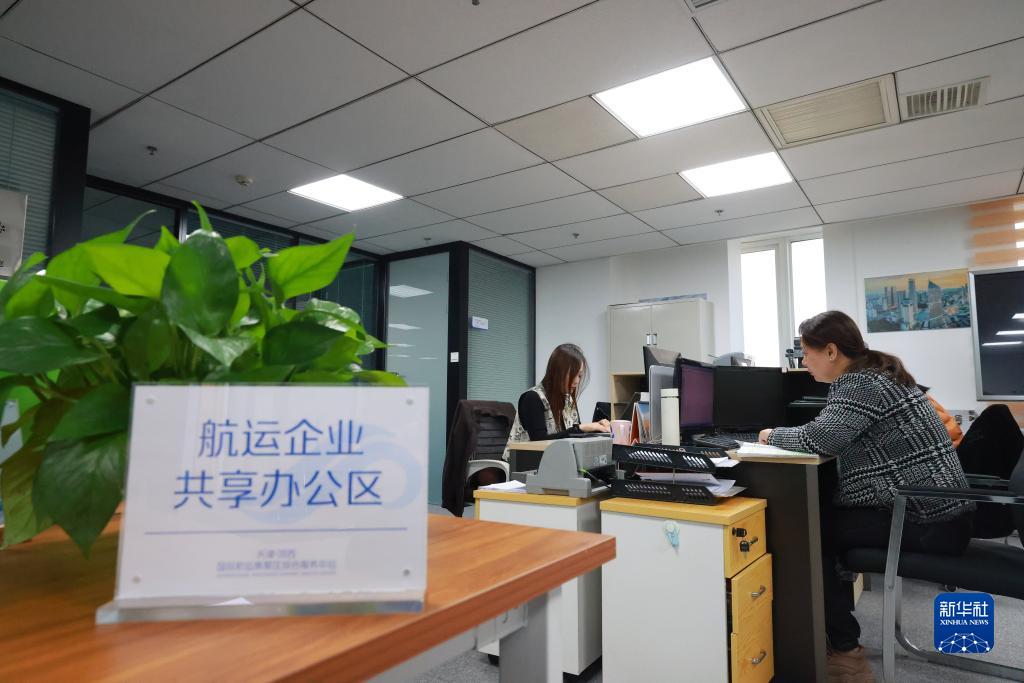 在天津國際航運大廈,企業(yè)職工在航運企業(yè)共享辦公區內辦公(11月14日攝)。