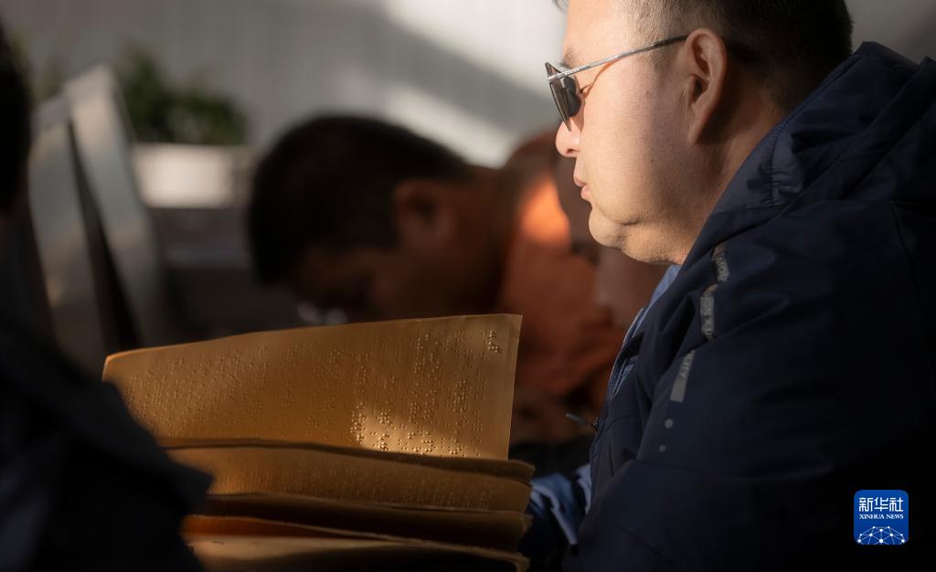 11月14日,在內蒙古烏拉特前旗圖書(shū)館視障閱覽室內,一名視障人士用指尖“閱讀”盲文書(shū)籍。