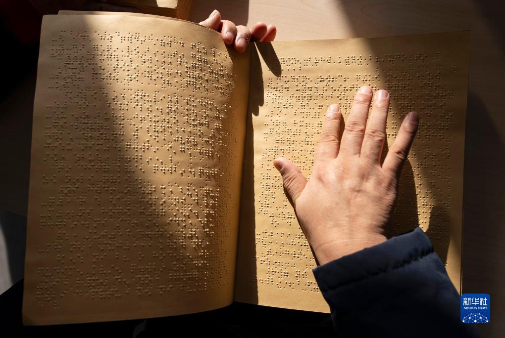 11月14日,在內蒙古烏拉特前旗圖書(shū)館視障閱覽室內,一名視障人士用指尖“閱讀”盲文書(shū)籍。