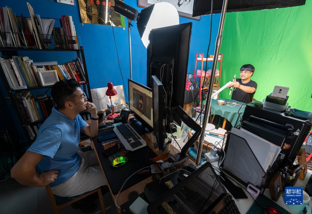 11月14日,在內蒙古烏拉特前旗的直播工作室內,齊天賜(右)在直播賣(mài)銀飾。