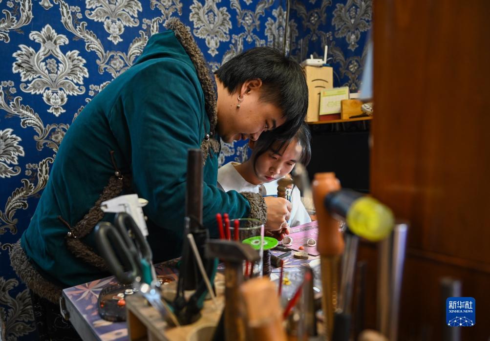 11月14日,在內蒙古烏拉特前旗禾蘇格爾銀匠店內,齊天賜(左)在教授學(xué)徒。