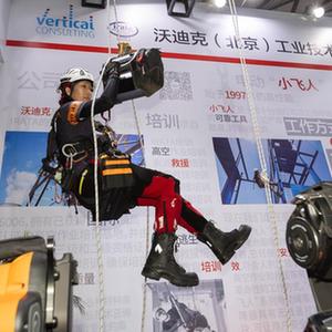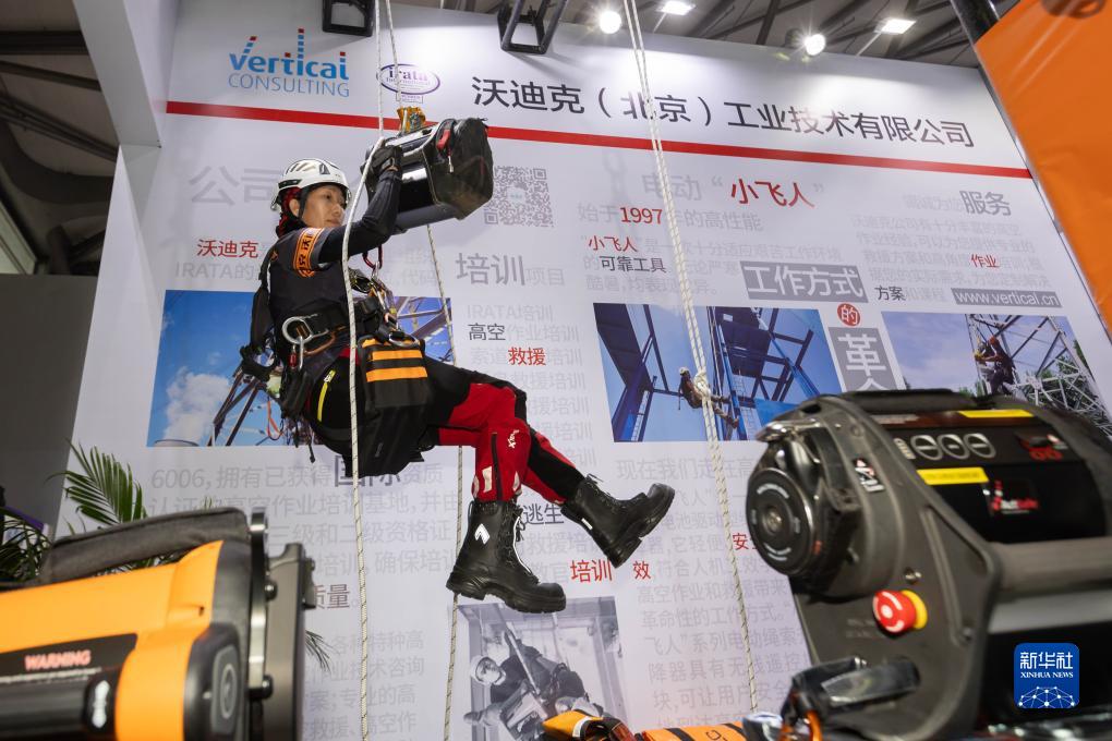 11月15日,在上海國際電力設備及技術(shù)展覽會(huì )的沃迪克展位,工作人員現場(chǎng)演示電動(dòng)升降機。