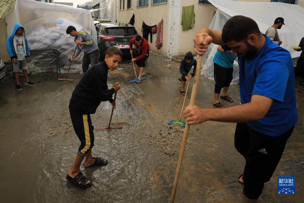 11月15日,巴勒斯坦人在加沙地帶南部城市汗尤尼斯的一處臨時(shí)營(yíng)地清理道路。