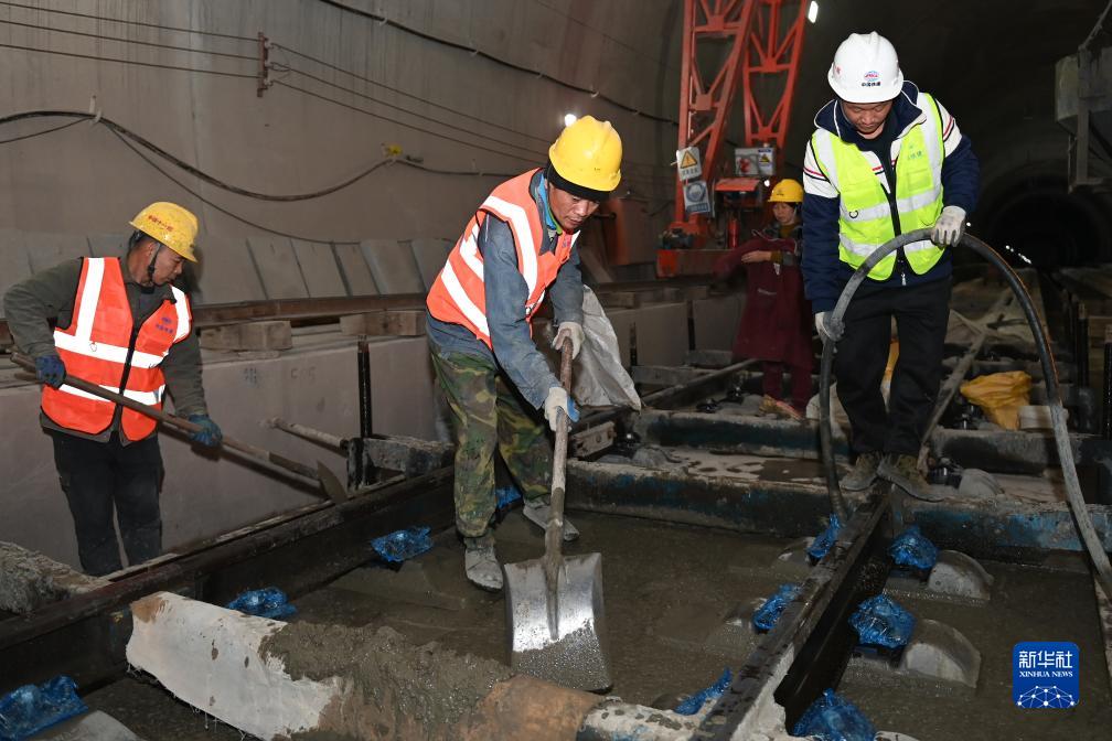 11月15日晚,中鐵十一局的建設者在杭衢鐵路(建衢段)天池山隧道無(wú)砟軌道澆筑施工現場(chǎng)作業(yè)。