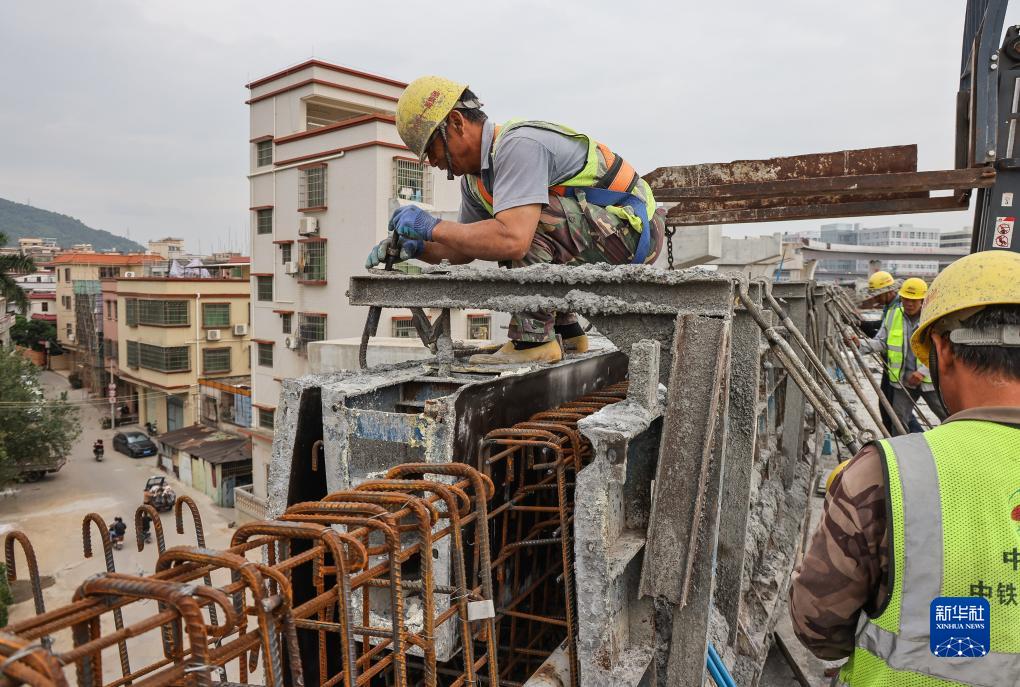 11月16日,建設者在中山坦神北路安裝護欄澆筑模具。