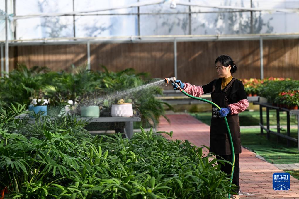 11月16日,在沭陽(yáng)縣顏集鎮沙灣村一處花卉大棚,花農在給花木澆水。