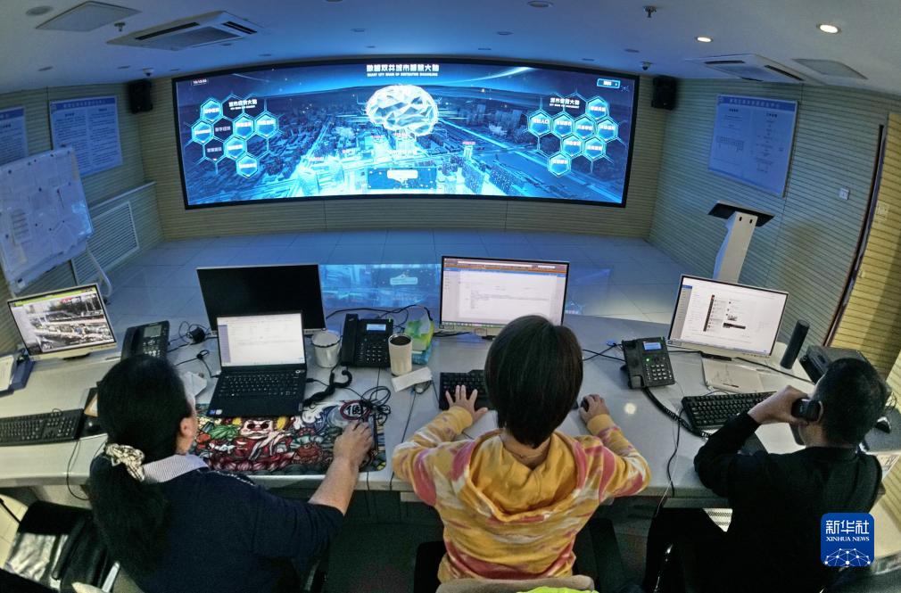 工作人員在雙井街道市民訴求處置中心的城市智慧大腦系統前工作(11月16日攝)。