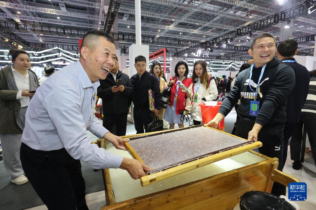 11月16日,在安徽展區,人們在師傅(左)的指導下現場(chǎng)體驗宣紙制作。