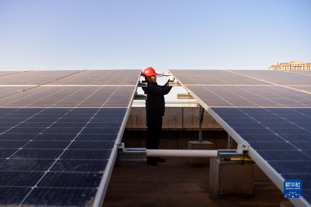 11月16日,工作人員在海勃灣區人民政府大樓屋頂檢查光伏設備。