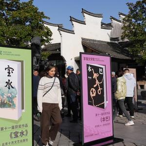 11月17日,人們從烏鎮景區展示的茅盾文學(xué)獎獲獎作品展板旁走過(guò)。