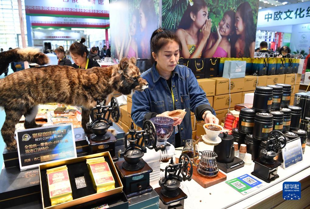 11月16日,印度尼西亞展位工作人員為觀(guān)眾制作一款貓屎咖啡。