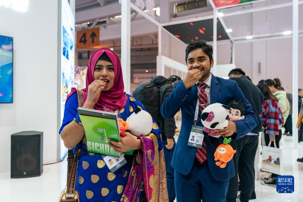 11月17日,兩名來(lái)自孟加拉國的參展商在2023中國國際旅游交易會(huì )上品嘗來(lái)自新疆的紅棗。