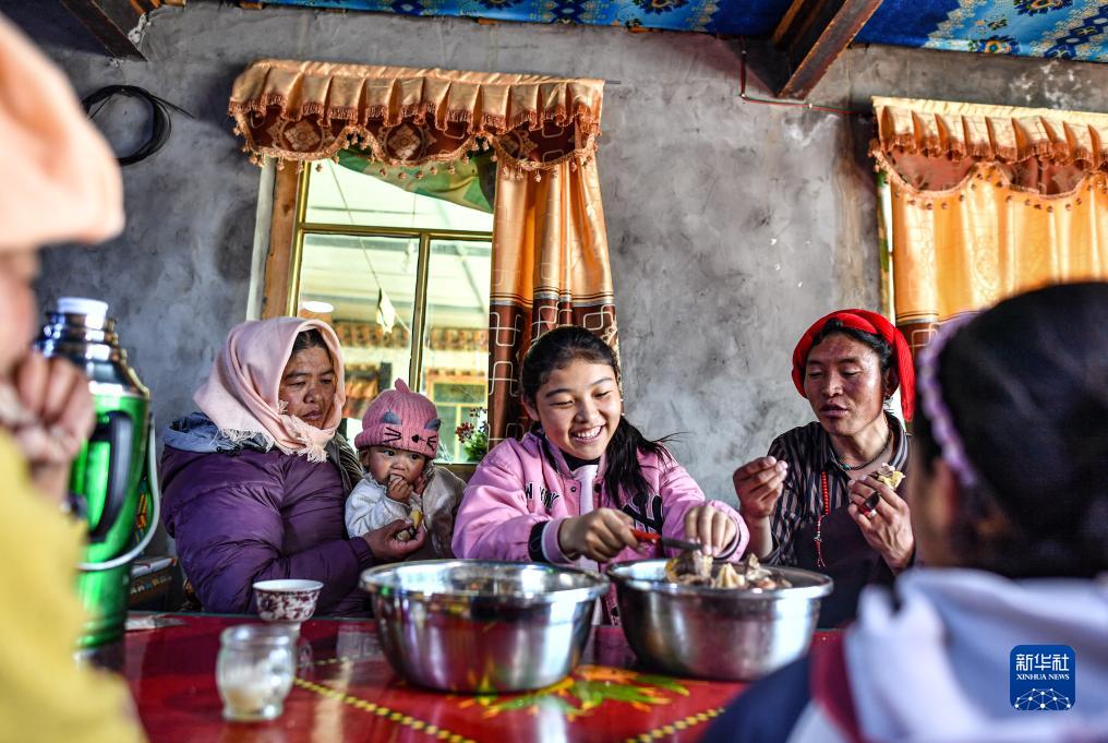 斯曲卓瑪(中)和家人一起吃飯(11月15日攝)。
