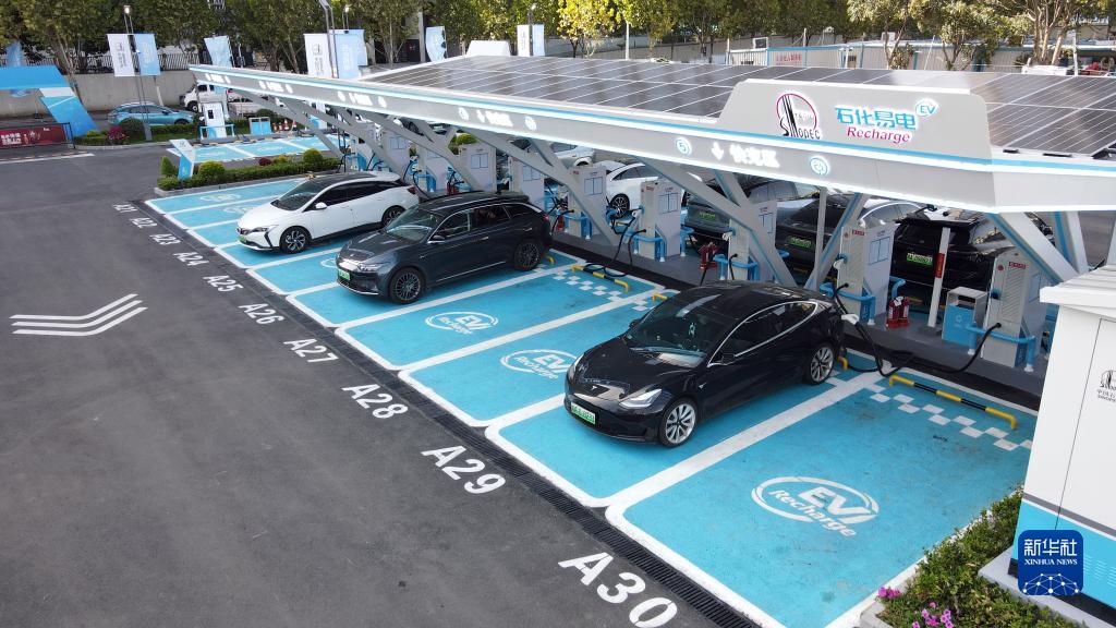 11月17日拍攝的安徽石油大眾綜合能源站內的充電車(chē)棚,車(chē)棚也可作為光伏發(fā)電站(無(wú)人機照片)。