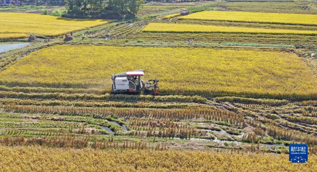 11月17日,浙江省臺州市仙居縣白塔鎮農民駕駛收割機搶收晚稻(無(wú)人機照片)。