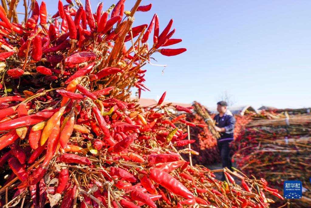 11月17日,農民在河北省唐山市玉田縣亮甲店鎮一家蔬菜專(zhuān)業(yè)合作社的場(chǎng)院搬運辣椒。