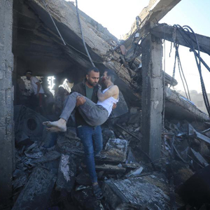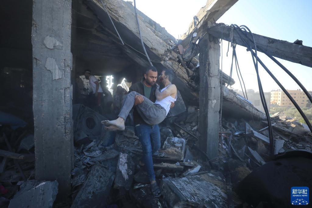 11月17日,在加沙地帶南部城市汗尤尼斯,人們在遭以色列襲擊后的建筑廢墟中實(shí)施救援。