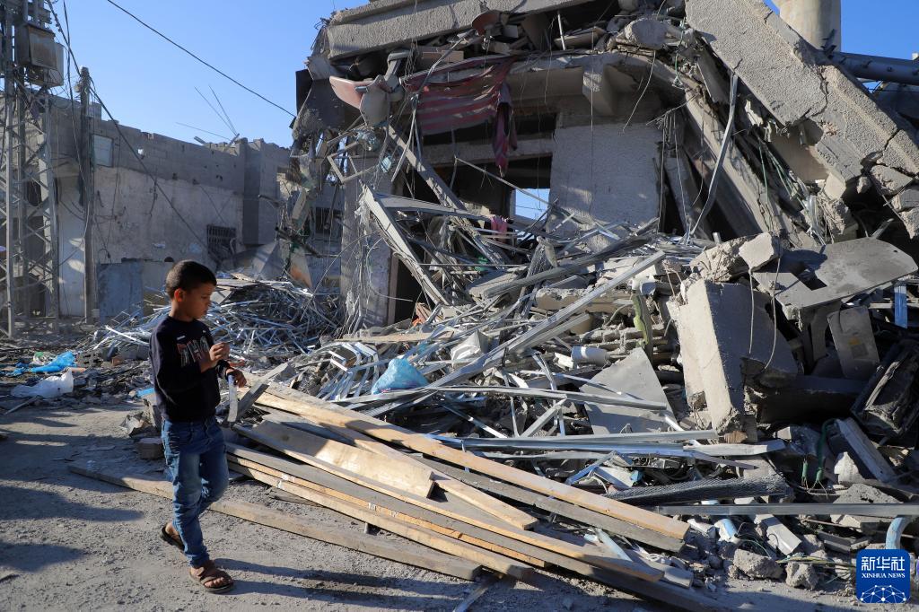 11月17日,在加沙地帶南部城市汗尤尼斯,一名男孩走過(guò)遭以色列襲擊后的建筑廢墟。