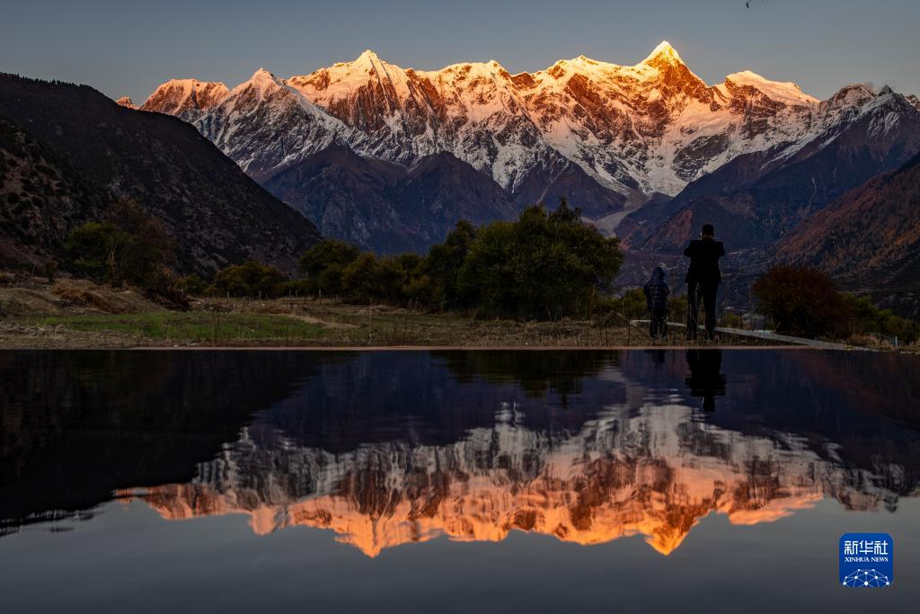 11月13日,游客在索松村拍攝日落時(shí)分的南迦巴瓦峰。