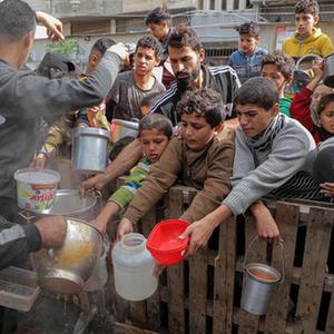 11月19日,在加沙地帶南部城市拉法,人們領(lǐng)取救濟食物。