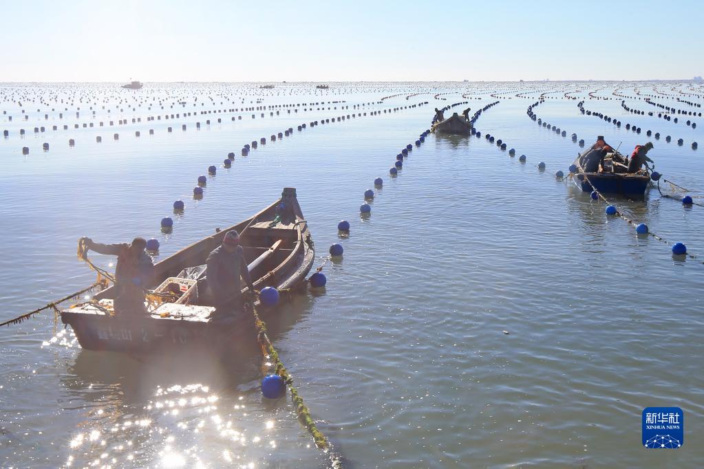 近期,在“海帶之都”山東省榮成市,海帶養殖區展開(kāi)海帶“播種”作業(yè),漁船在海面來(lái)往穿梭,一派忙碌景象。