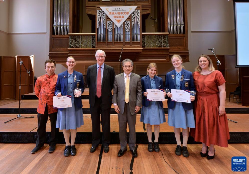 11月18日,在澳大利亞阿德萊德,中國駐阿德萊德總領(lǐng)事李東(中),澳中文化交流促進(jìn)會(huì )榮譽(yù)會(huì )長(cháng)約翰·塔普林(左三)與“澳洲人唱中文歌”比賽一等獎獲得者沃爾福德圣公會(huì )女子學(xué)?!疤鹈勖邸苯M合合影。